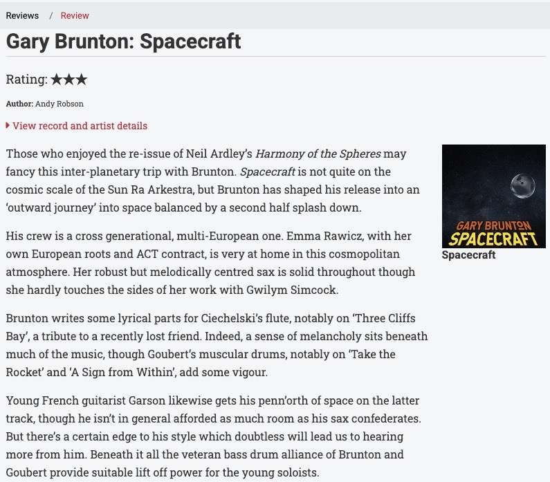 Spacecraft Listen Mondo Jazz — Radio Free Brooklyn — 03/09/25 Jazzpirine — 13/07/25 Spacecraft on Cambridge jazz — 22/06/25 Press DownBeat — August 2025 Jazz Magazine — August 2025 Jazzwise *** — August 2025 L’Autour et le Spacecraft Jazz Magazine — 11th January 2025 la terrasse n°328 — January 2025